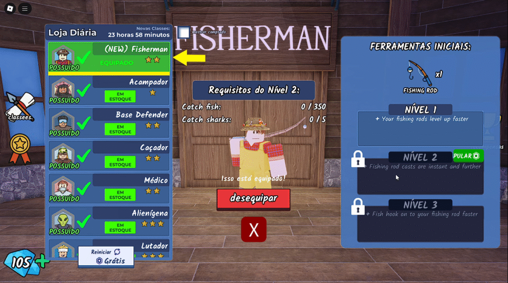 - Nível 1: Já vem com a classe Fisherman, permitindo que você arremesse a linha mais rapidamente.
