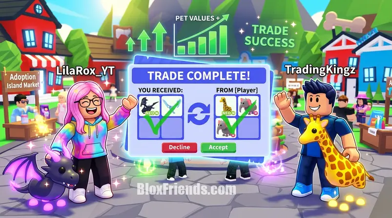 Imagem de um jogador de Adopt Me! realizando um trade bem-sucedido, com a janela de troca exibindo pets valiosos e moedas.