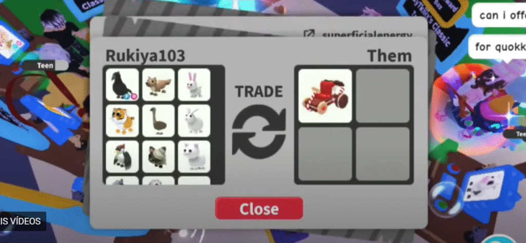 - Acompanhe os Valores: Os valores dos pets flutuam bastante, dependendo da popularidade e da raridade. Use sites da comunidade, como o “Adopt Me Trading Values” e o “Elve”, para verificar os valores e simular trocas antes de aceitá-las.