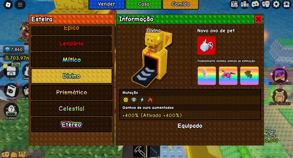 - Melhore sua Esteira (Conveyor): O primeiro investimento que você deve fazer é na sua esteira transportadora. Melhorá-la é crucial, pois ela passa a gerar ovos de pets melhores, mais fortes e que valem muito mais dinheiro por segundo.