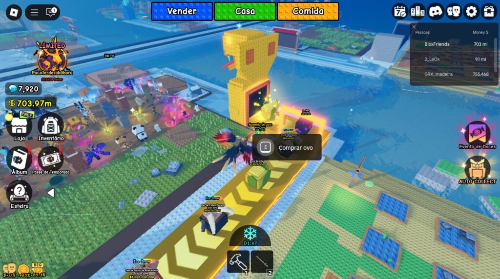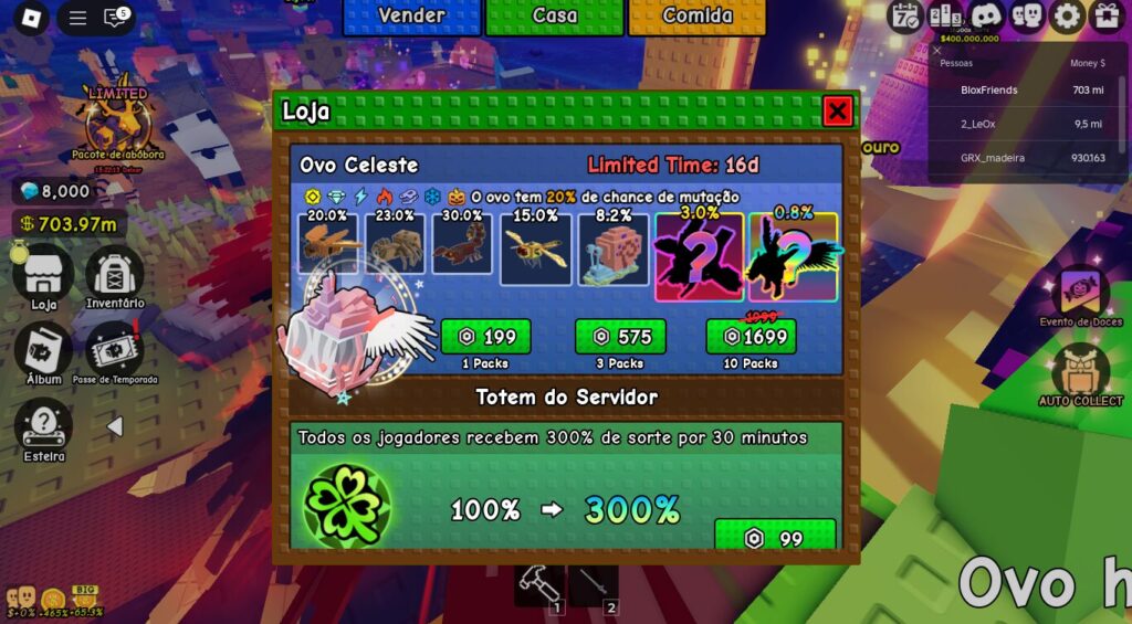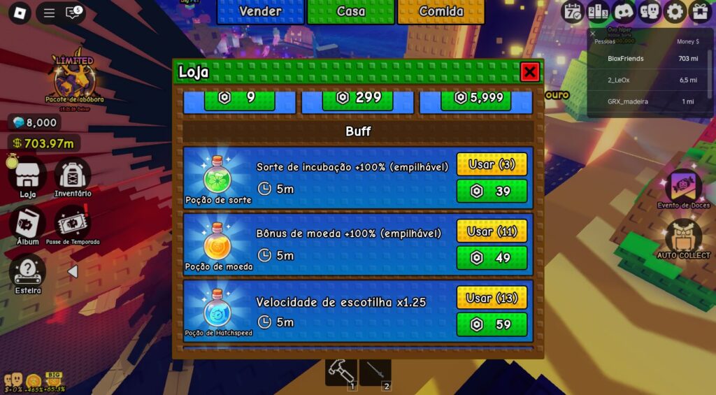 - Pets e Ovos Exclusivos: Existem opções de Pet Gigante que só podem ser compradas com Robux. Estes pets costumam ter multiplicadores de dinheiro muito superiores.