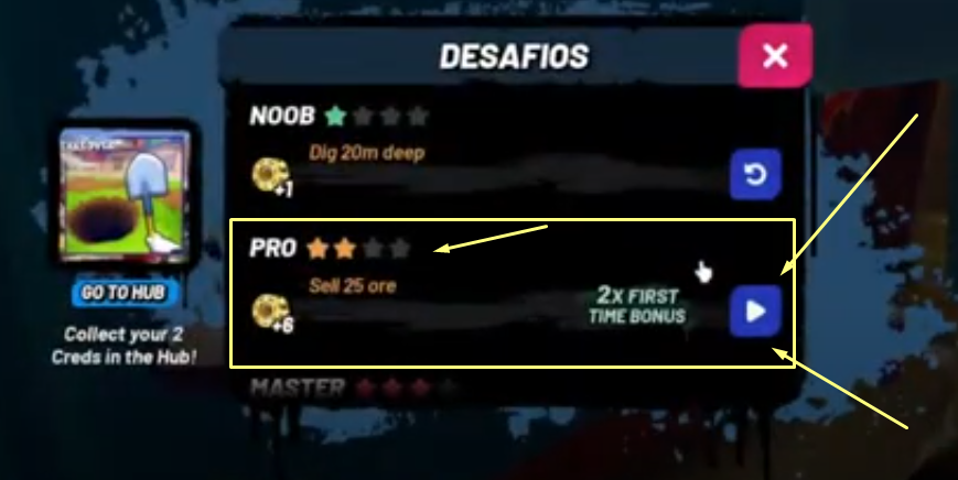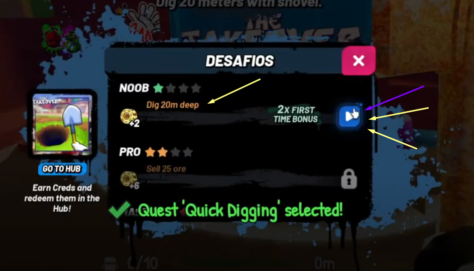 - Repita a segunda missão: O segredo do “farm” é a segunda missão, que pede para você “coletar 25 minérios”. Ao completá-la, você ganha 6 moedas na primeira vez e 3 moedas nas repetições. Com a pá e a mochila aprimoradas, você pode completar essa missão em menos de 10 segundos, tornando-a extremamente eficiente.