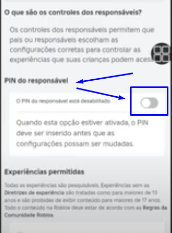 - Ative o PIN dos pais: Role a tela até a seção “PIN dos pais” e ative a opção.