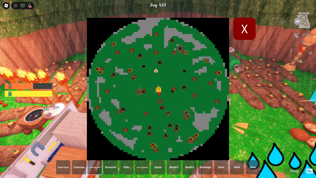 • Mapa e Bússola: Esses itens são essenciais para iniciantes. Enquanto o Mapa mostra a localização de recursos, cabanas e baús, a Bússola é crucial para encontrar as quatro crianças desaparecidas, que são o objetivo principal do jogo. Ao interagir com o quadro de crianças na base, a bússola passará a apontar para a direção delas, facilitando a missão e avançando rapidamente o contador de dias.