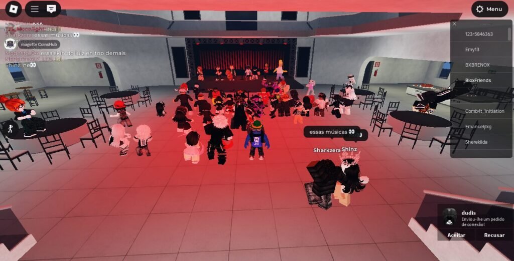 • Competições de Estilo (Não Oficiais): Inicie brincadeiras de “Melhor Avatar da Noite” ou “Melhor Sincronia de Dança” com outros jogadores no chat. Isso é super divertido e faz com que todos no servidor prestem atenção em você.