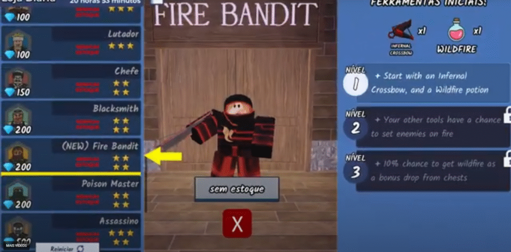 - Novas Classes e Habilidades: A estrela é a classe Fire Bandit (Bandido do Fogo), perfeita para quem gosta de ação. Ele começa equipado com uma poderosa Infernal Crossbow (Besta Infernal), que não só causa dano absurdo, mas também dispara flechas de fogo que cozinham a carne dos animais instantaneamente! Para completar, ele também possui uma Wildfire Potion (Poção de Fogo Selvagem), ideal para controle de área.