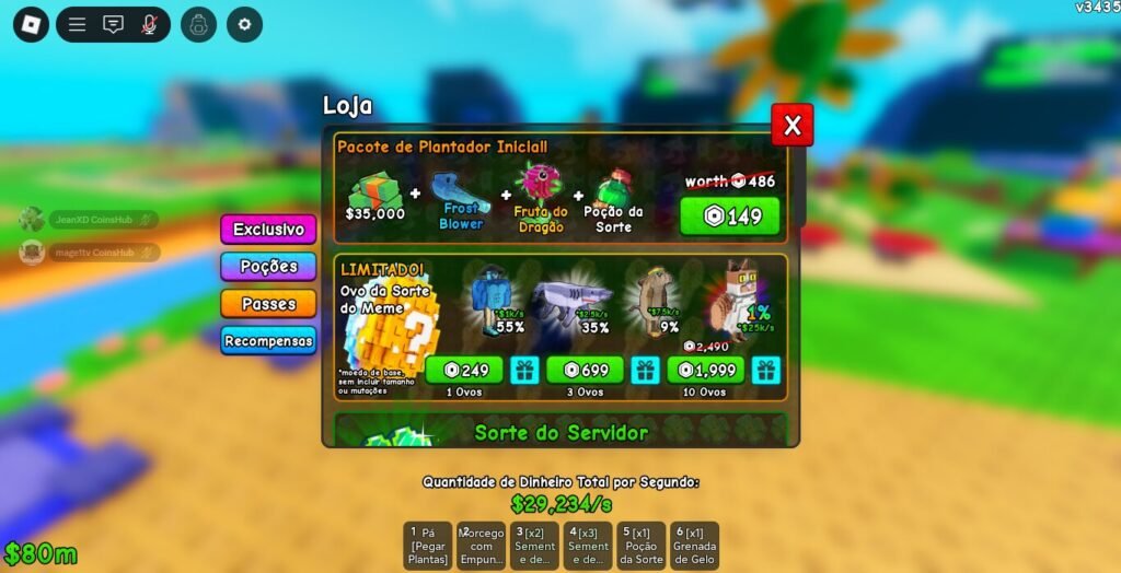 - Multiplicadores de Lucro (Game Passes): O investimento mais recomendado. Passes que dobram ou triplicam o dinheiro do farming e da venda de Célebrotes permitem que você compre todas as sementes raras e Pads em minutos.