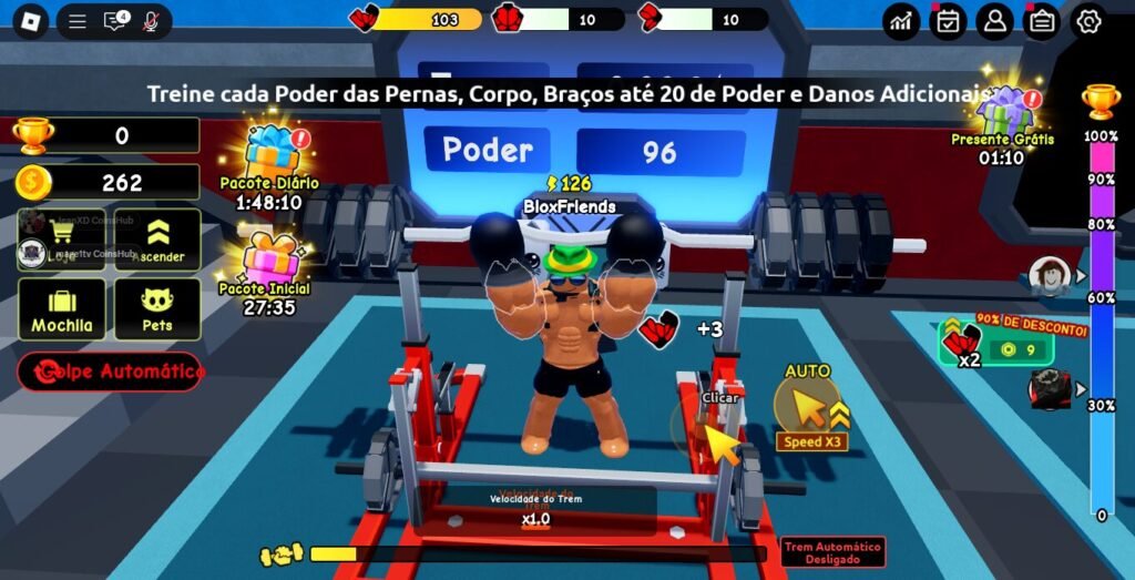 3. Bônus de Jogador Premium: Jogadores que compram o status Premium (Geralmente um Gamepass ou por ter Robux ativo) ganham um buff automático de +20% na velocidade e +10% na força, o que é uma enorme vantagem no grinding inicial.