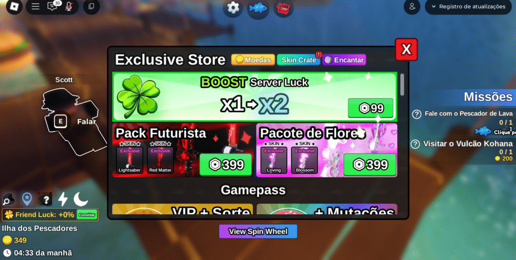 - Passe de Sorte Avançado: O jogo oferece um “Passe de Sorte Avançado”, que pode ser adquirido com Robux e aumenta permanentemente a sua chance de pegar peixes raros e lendários.