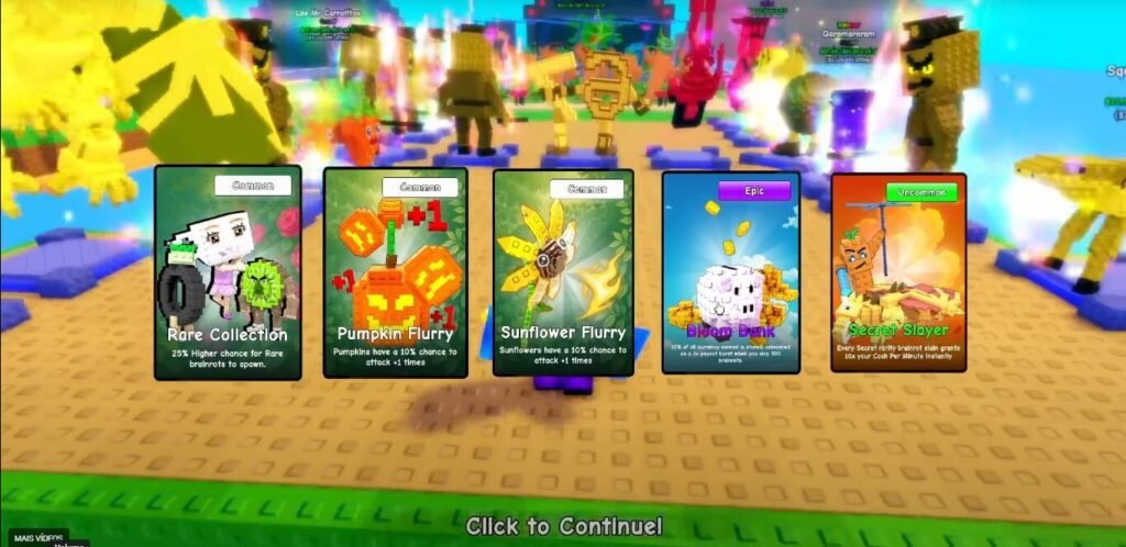 - Priorize os Slots do Jardim: Use o dinheiro inicial para comprar todos os slots de plantio. Quanto mais plantas você tiver, mais Brainrots serão derrotados e, mais importante, mais Sorte (Luck) você terá (um jardim completo aumenta drasticamente sua chance de obter Brainrots raros).
