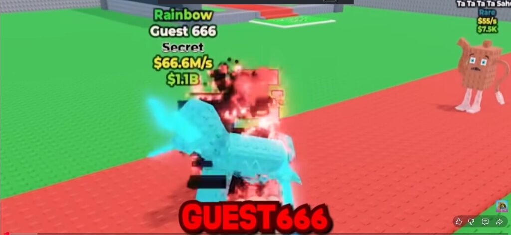 - Impacto: O Brainrot 1x1x1x1 é um segredo valioso, mas a verdadeira joia é o Guest666, que possui apenas 1% de chance de ser invocado. Ele é um dos Brainrots mais poderosos adicionados, capaz de gerar ganhos absurdos.