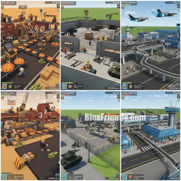 Colagem de capturas de tela de jogos Roblox Tycoon mostrando diferentes fases de construção de impérios, como fábrica de pizza e base militar.